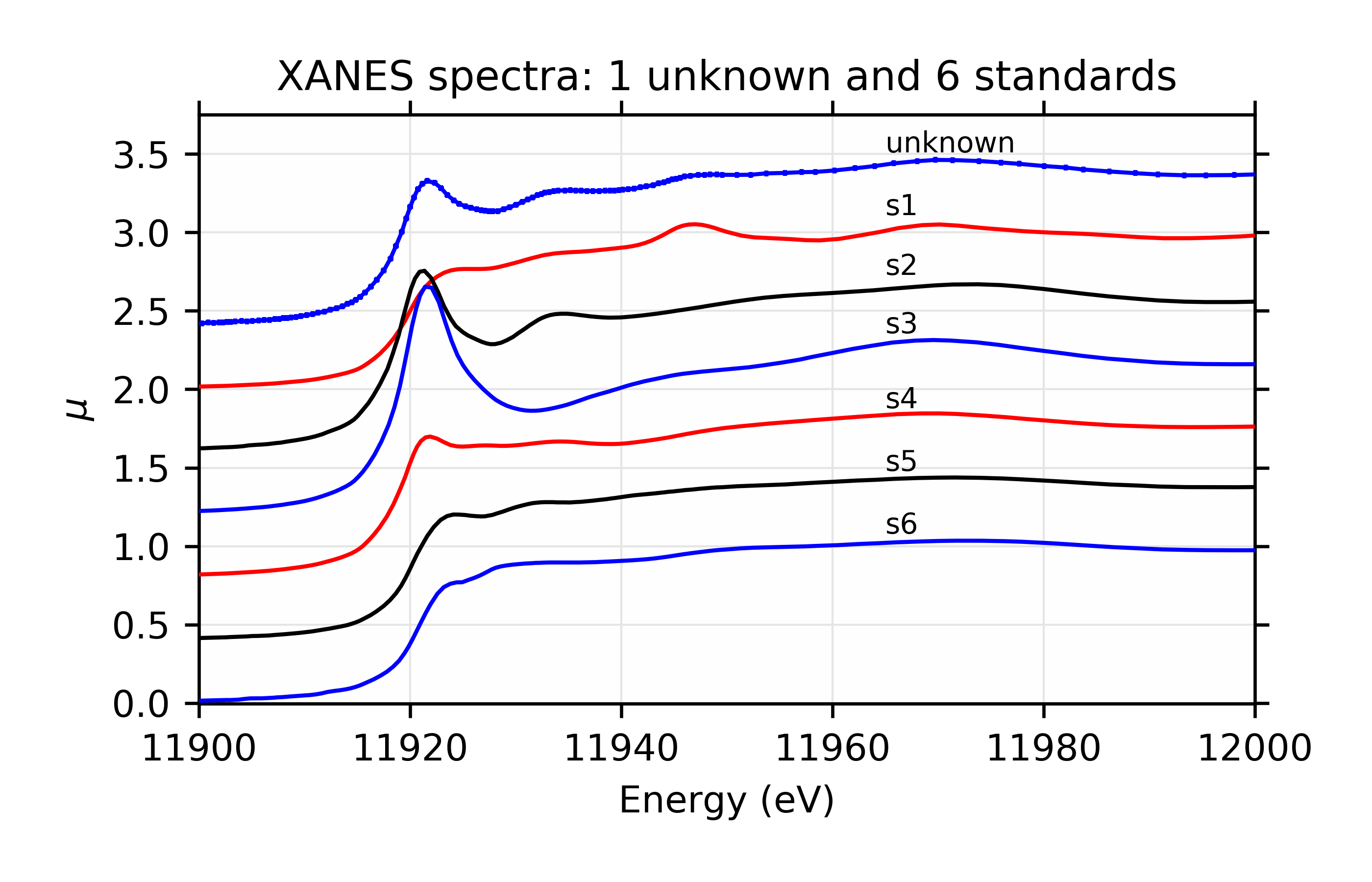 From the plots alone, it is difficult to tell which of these fits is better, and it is probably best to say that these are both good fits. This implies that component s3 is important even if at a very small fraction, and that either component s5 or s6 (which aren’t that different spectroscopically or chemically (see Figure 8.6.8) is present. Of course, the analysis here is not meant to be definitive, and there are many more checks that could be done. To be clear, [Larch_1] looked at many more unknown spectra, and also adjusted the energy ranges of the fits, and concludedd that s1, s2, s3, and s5 were the best components, with concentrations of the components very similar to the ones found here.