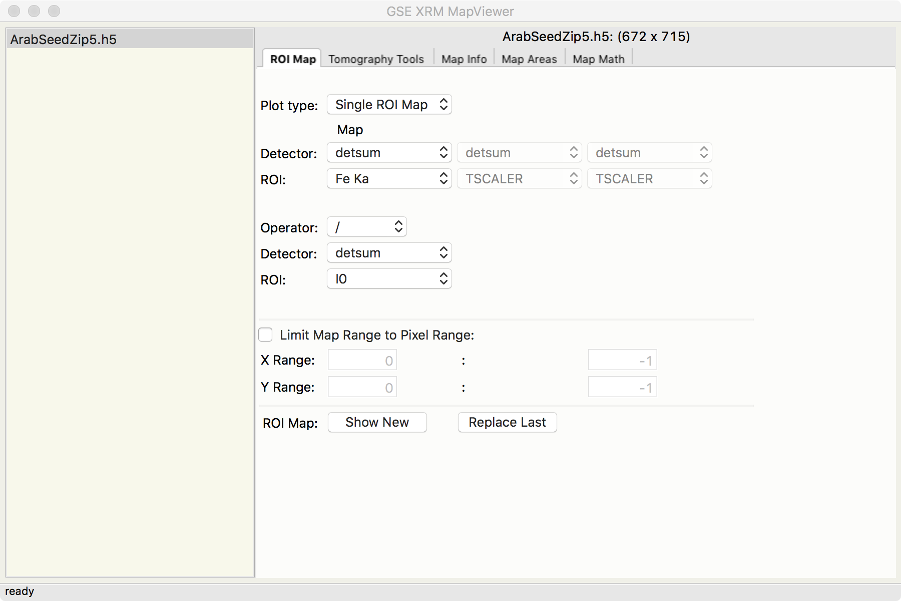 In the first (left most and default) of these tabbed views, one can select pre-calculated Regions of Interest (ROIs) for viewing. These ROIs usually representing a single X-ray fluorescence line for a single element. One can view these ROI data as intensity mapse, either shown as a false-color image for a single ROI, a Red-Green-Blue image for 3 different ROIs, or as a 2-D grid of maps and correlation plots for 2 different ROIs.