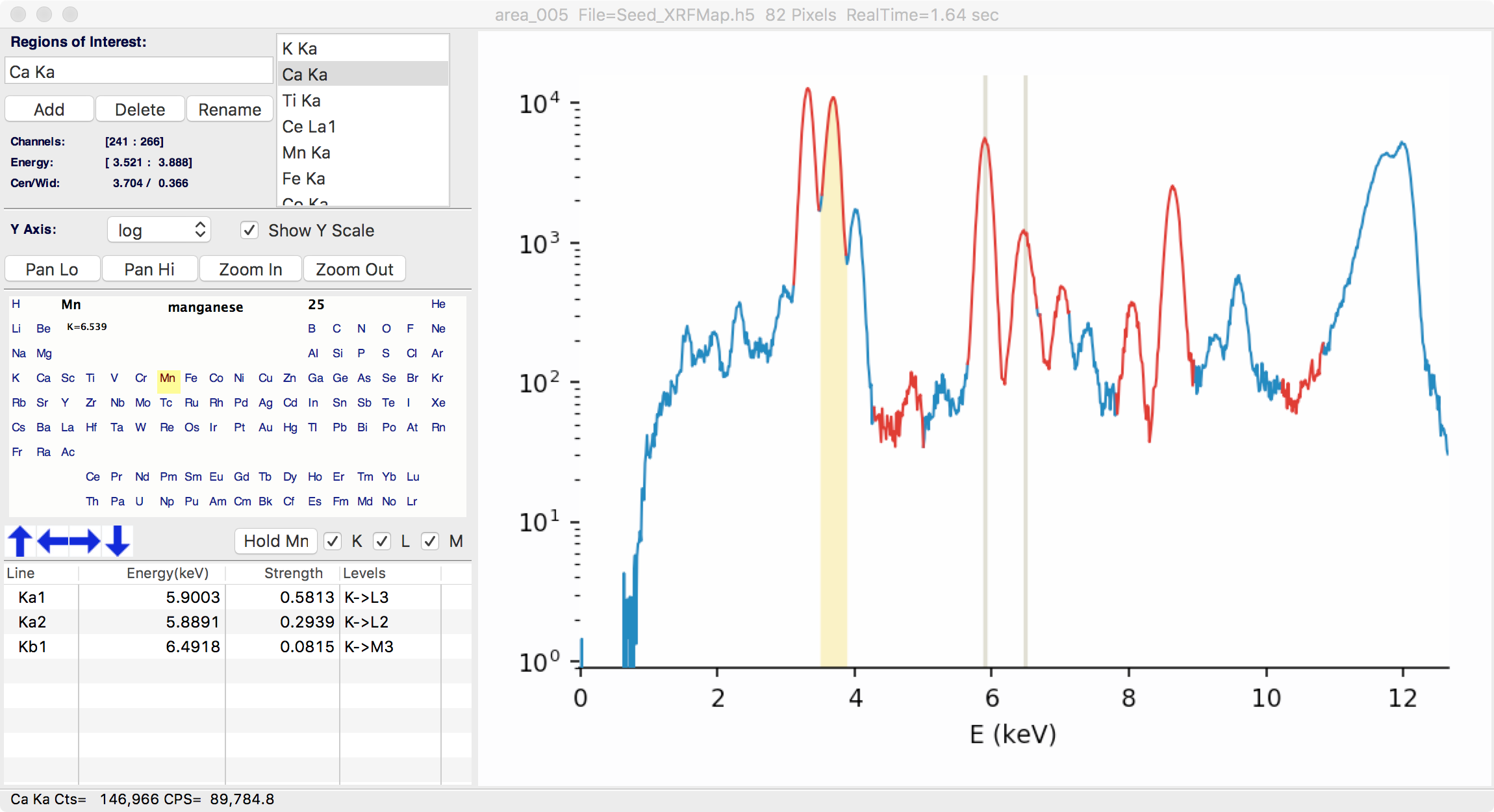 The user can also put the cursor into a mode to “Pick Area for XRF Spectrum”. In this mode, the mouse is used to draw freestyle “lasso box” around any selected points in the map. When released, the full X-ray fluorescence spectrum from that map area is extracted from the map and displays, as shown below.