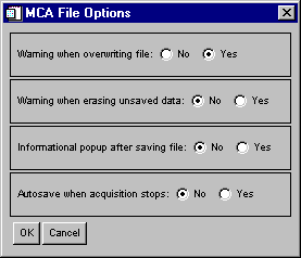 The meaning of the various choices is self-explanatory. Choose Yes to activate the choice. Particularly, you have an option to let MCA Display to automatically save the data. This is useful when you set up the MCA to collect a series of data files at a fixed pressure and temperature condition (such as in kinetics or other time resolved experiments). By selecting yes for “Autosave when acquisition stops”, MCA will collect data for a prescribed presets time (see Controls), stop data collection, save the data in the file sequence as defined by the Save Next option, erasing the data from the MCA, and start a new data collection. You may select yes for “Informational popup after saving file”, so that you will be informed every time a data file is saved.