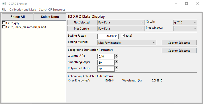 The Larch XRD1D application allows simple viewing and manipulation of 1-dimensional XRD patterns of diffracted intensity as a function of scattering wavenumber or angle: \(I(q)\), \(I(2\theta)\). The application allows